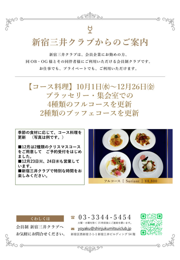 新宿三井クラブでは、季節の食材を用いた10月~12月の新メニュー